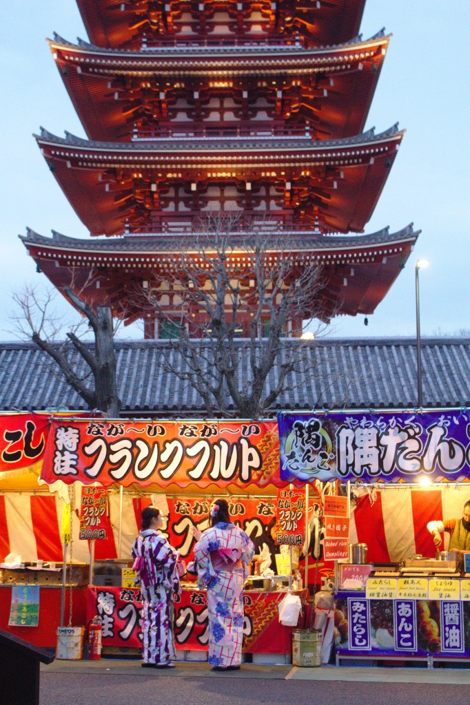 Asakusa est souvent l’un des premiers endroits où l’on met les pieds en arrivant à Tokyo. Et pour cause, ce quartier à lui seul résume la ville : le majestueux temple Senso-Ji d’où l’on aperçoit la moderne Tokyo Tower, les restaurants à la devanture de bois entourés par les salles d’arcades où l’on joue au baseball sur le toit, sans oublier les galeries marchandes couvertes entrecoupées par des petites rues étroites noyées dans une jungle de câbles (mention spéciale au Don Quijote, énorme magasin fourre-tout sur plusieurs étages où l’on trouve de tout, des biscuits petit-déjeuner aux goûts extravagants, aux produits de cosmétiques, en passant par des peluches Pokémon).