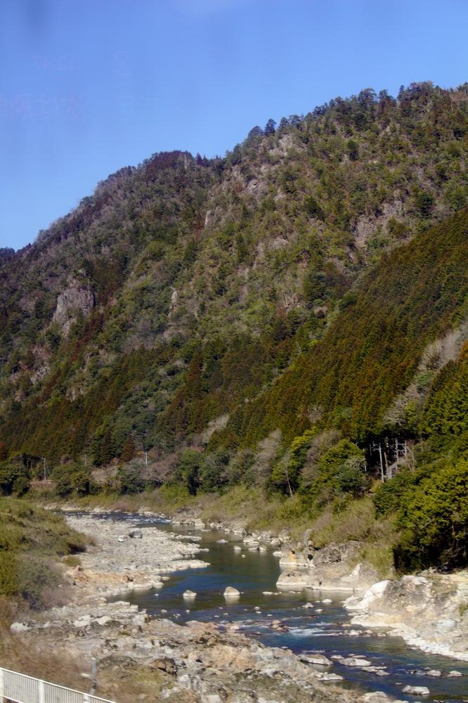 Le second train est plus rustique d’apparence, et dégage une étonnante odeur d’essence. C’est plus tranquillement qu’il nous balade le temps des quatre heures de trajet entre Nagoya et Takayama. Au début le train traverse la campagne peuplée de petites maisons, mais très vite nous nous retrouvons à slalomer entre les sapins au bord d’une rivière cerclée de rochers. Le voyage passe d’autant plus vite qu’une petite voix préenregistrée nous détaile l’histoire des endroits que nous traversons (la visite guidée par train, un concept original). Et les surprises sont nombreuses dans ces montagnes. A l’angle d’un virage nous apercevons même un singe dans les arbres.