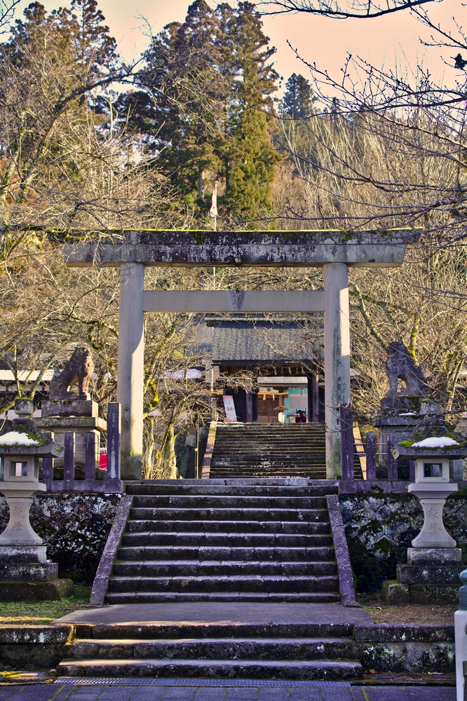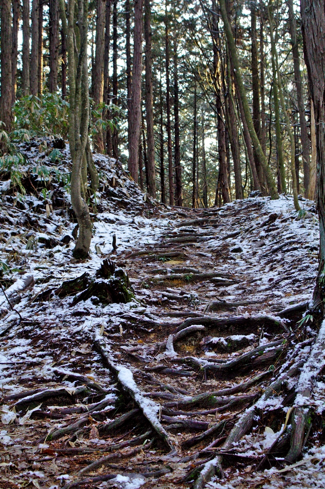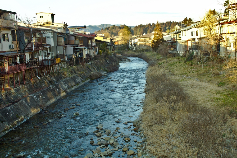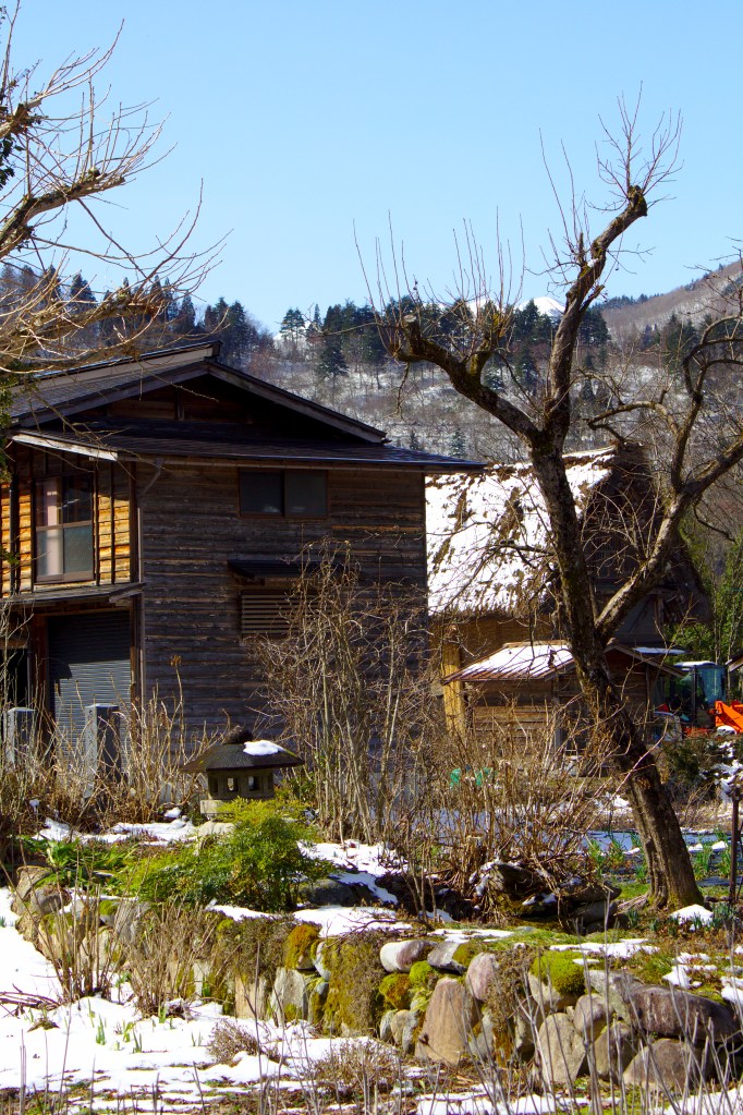 Ce quartier de Takayama est en réalité un doux mélange de ville, de campagne et de forêt. Par cette fin de journée de mars, la faible lumière qui brille encore ne fait que renforcer cette impression de douceur. Il fait froid (très froid même, comme en témoignent les restes de neige qui ne fondent pas au soleil), et pourtant on se sent comme dans un cocon chaleureux…et un peu mystique aussi.