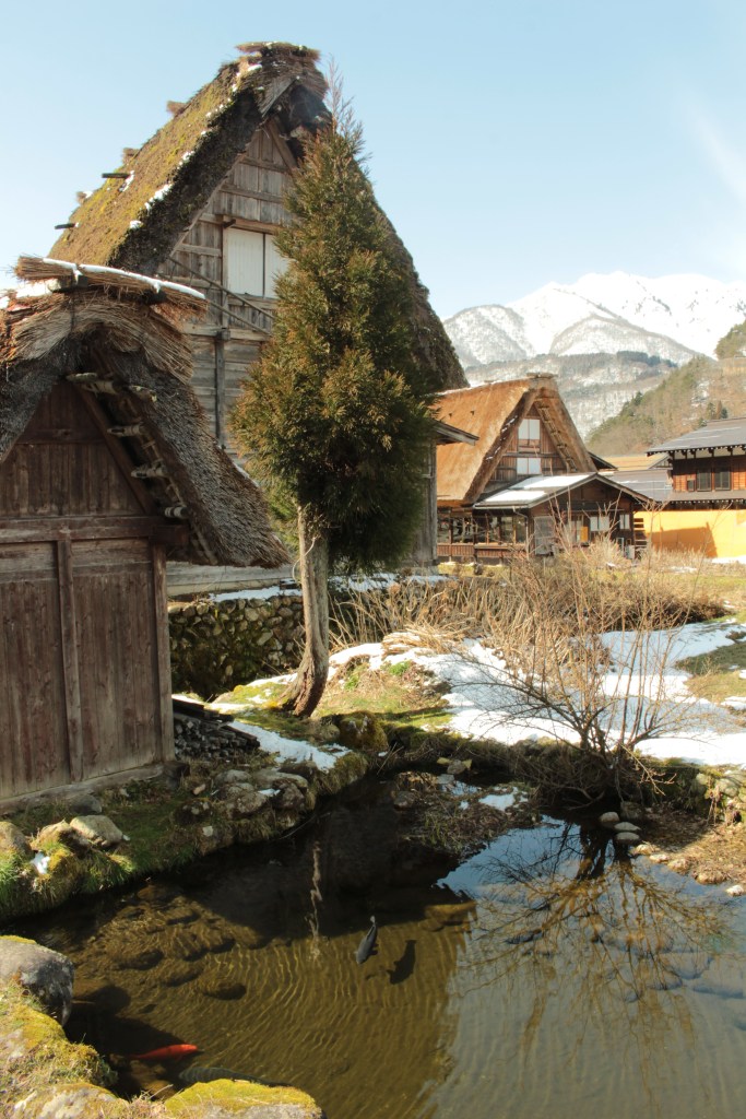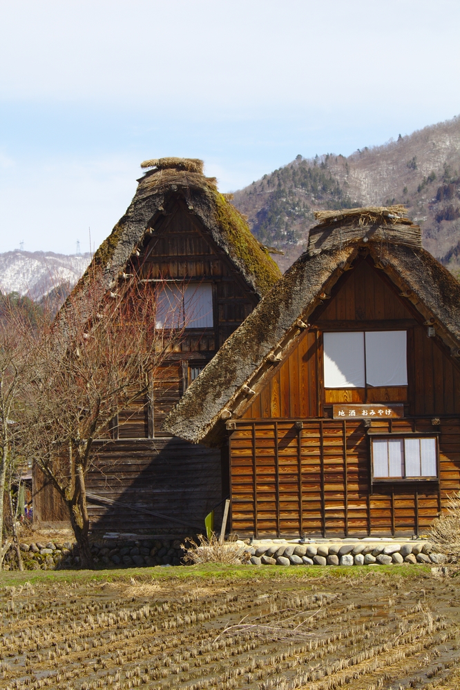 Le village d’Ogimachi est célèbre pour ses maisons de style « gassho-zukuri« . Ce nom fait référence aux toits de chaume très pentus de ces maisons traditionnelles, qui rappellent la forme de mains jointes pour la prière (« gassho-zukuri » signifie « paumes réunies »). Dans cette région montagneuse, les hivers sont rudes, et la forme très inclinée des toits permet d’évacuer plus facilement la neige. Dans ces maisons, les familles vivaient en général au rez-de-chaussée, plutôt bas de plafond pour faciliter le chauffage des pièces, les combles étant utilisées pour l’élevage de vers à soie. Beaucoup sont encore aujourd’hui habitées, mais certaines ont été reconverties en gîte, où il est possible de passer la nuit.