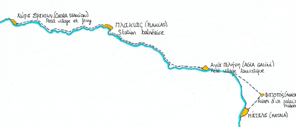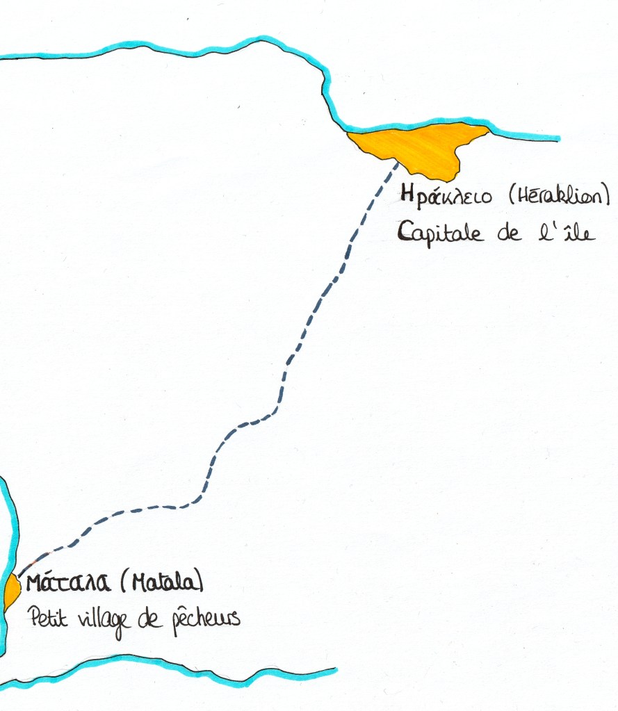 Après avoir longé la côte grecque, l’avion se pose à l’aéroport d’Héraklion, plus grand ville et capitale de la Crète. La voiture de location récupérée, nous filons déjà vers le sud, destination Matala, petite station balnéaire de la côte sud.