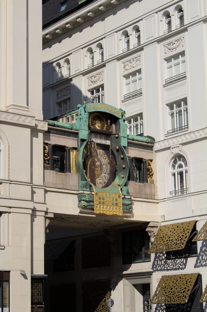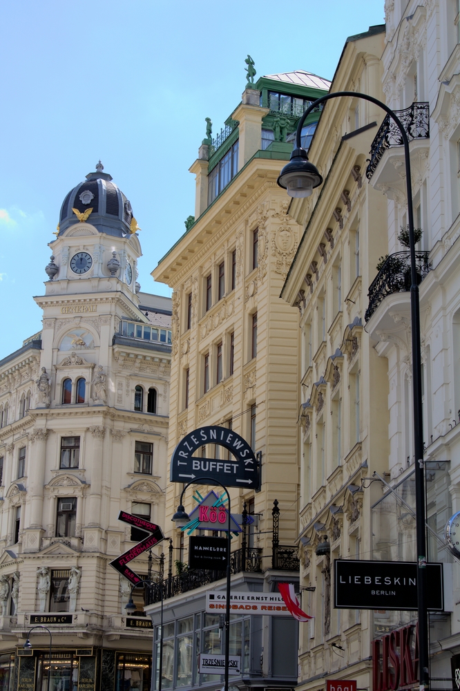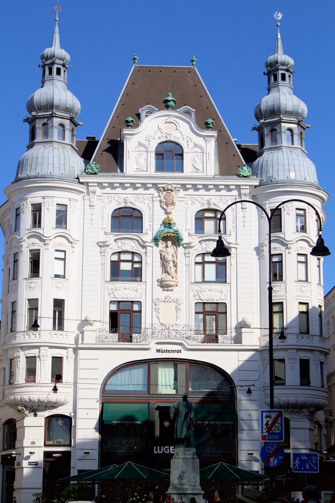 De part et d’autres du Nachsmarkt, les façades art nouveau des bâtiments sont richement décorées. A deux pas on découvre d’ailleurs le Pavillon de la Sécession, magnifique salle d’exposition blanc et or construit en 1897.