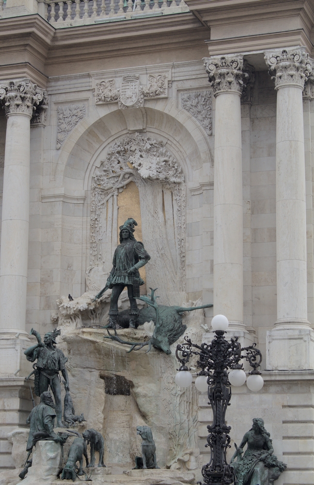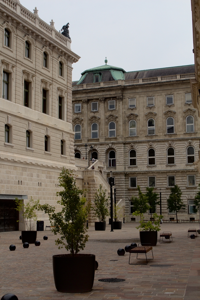 Pour continuer depuis la terrasse d’Eugène de Savoie, empruntez le petit passage situé sous les arcades au niveau de la coupole (ça y est, je sens que je vous ai perdus). Il vous mènera jusqu’à la cour Hunyadi (Hunyadi udvar) où se situe la fontaine Mátyás (Mátyás–kút), ma préférée du château parce qu’elle représente des chiens. De cette cour s’ouvre la fameuse nouvelle aile du palais récemment rénovée que nous sommes venus voir.