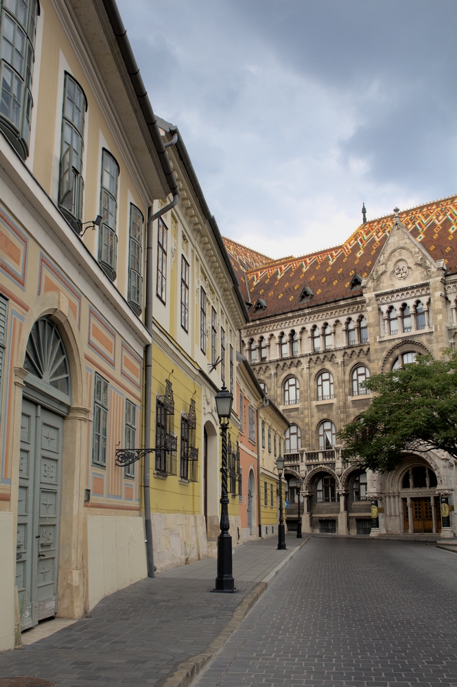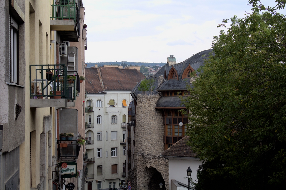 La balade commence là où nous avions arrêté la précédente : devant la porte de Vienne (Bécsi kapu), belle porte de pierre qui marque la sortie du château. Une fois sortis, je vous invite à vous diriger tout droit vers la rue Ostrom (« Ostrom utca ») afin de découvrir cette rue typique du quartier aux immeubles de tons jaunes, ocre et orangés.