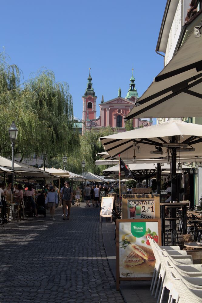 La place Prešeren (Prešernov trg) se dresse de l’autre côté de la Ljubljanica, magnifique avec son église franciscaine à la façade rose et ses petits arbres, les élégants détails de la maison Hauptmann (Hauptmannova hiša : mon coup de cœur de la ville) et ses petits pavés en cercle.