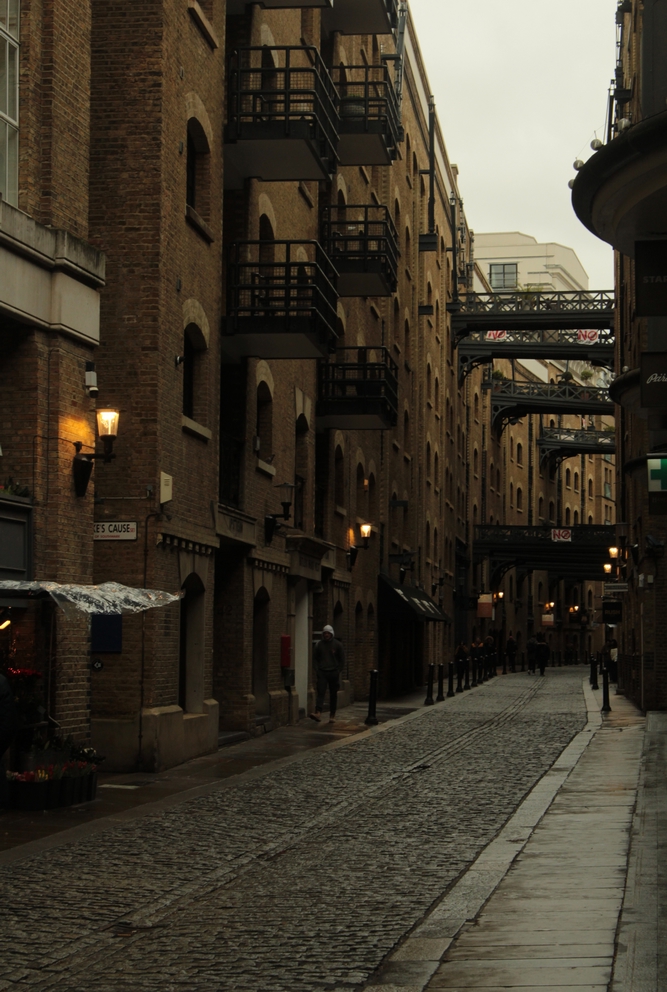 Ce fameux petit escalier où tout commence donne directement sur Shad Thames, longue rue de briques et d’anciens entrepôts, ornée de sombres passerelles. J’avais déjà eu l’occasion d’entrapercevoir cette rue lors d’un précédent passage dans le quartier et l’image de ces petits ponts zigzaguant entre ces hauts immeubles ne m’avait pas quittée. Dans mon imaginaire, Shad Thames représente tout ce que j’aime à Londres : les briques, les bâtiments que l’on devine chargés d’histoire et cette ambiance un peu mystérieuse (ne me demandez pas pourquoi, mais pour moi Londres est le cadre parfait pour les histoires de détective et de maisons hantées – pas étonnant que Sherlock Holmes y ait sa résidence).