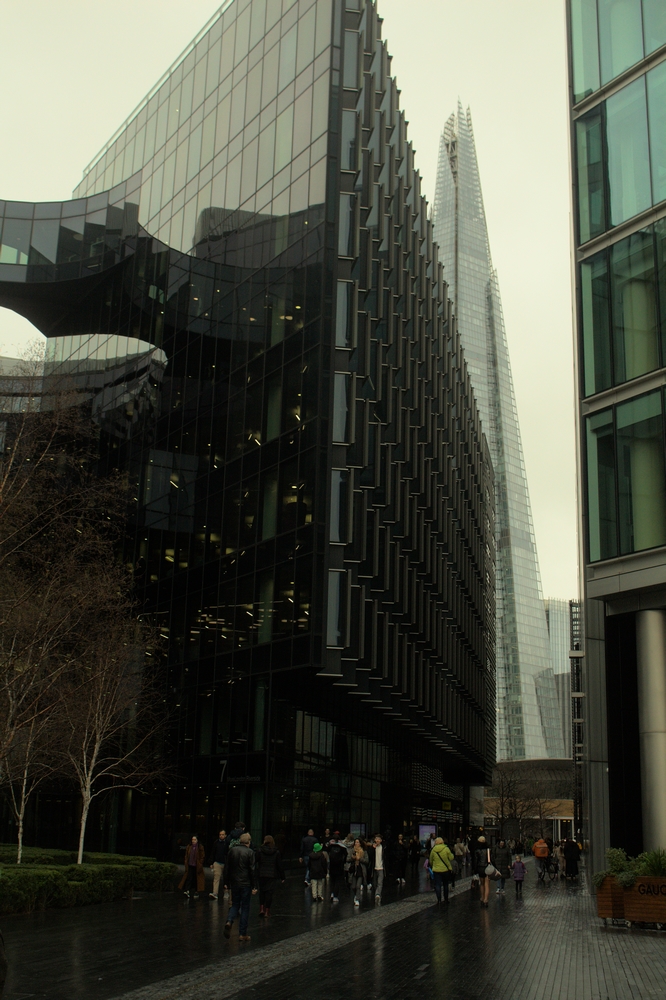Ma boucle terminée, je reviens vers Shad Thames et poursuit ma route sur une promenade aménagée le long de la Tamise (« the Queen’s walk« ). Celle-ci mène vers une zone plus moderne, constituée notamment de la place More London, grande place toute pavée de briques grises et cernée de bâtiments vitrées d’où l’on peut apercevoir le désormais célèbre Shard, plus haute tour de Londres du haut de ses 310 mètres (et l’une des plus hautes d’Europe) achevée en 2012.