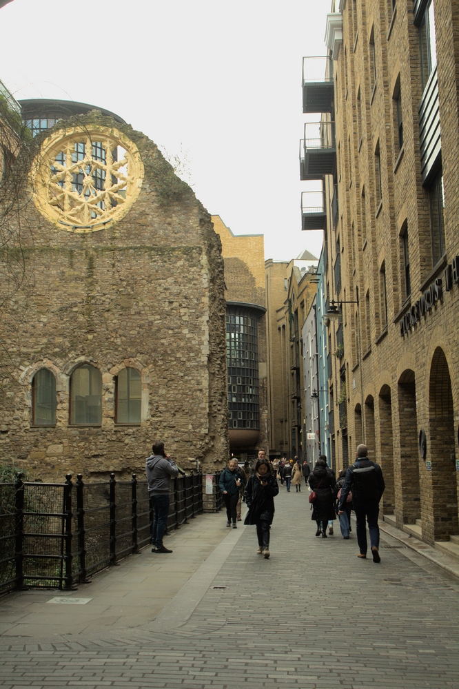 Je reviens vers la Tamise, en croisant au passage une reproduction du Golden Hind le navire du célèbre corsaire Francis Drake, avant de me décider à tourner dans la rue Clink Street attirée par les ruines d’un vieux bâtiment. Un panneau m’apprendra qu’il s’agit des ruines du Winchester Palace, un magnifique palais de style Tudor qui fut à son époque l’un des plus grands bâtiments de Londres et dont il ne reste aujourd’hui plus qu’un mur orné d’une rosace. Le tout se fond tellement dans le décor que les ruines sont aujourd’hui presque éclipsées par le reste de la rue et qu’il suffit de ne pas trop lever les yeux pour passer à côté de ce qui fut, à une époque, l’un des plus prestigieux bâtiments de la capitale.